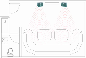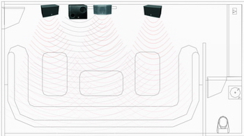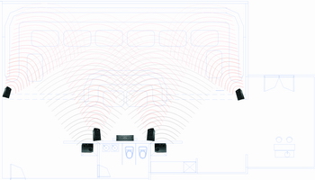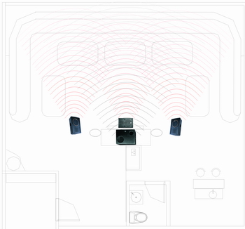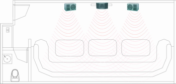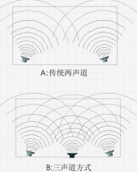 ,從聲音效果上,能夠使聲音的密度感更好,聲場更加寬闊,能夠很好的營造出臨場感和現場氣氛。傳統模式和三聲道模式的聲場比較示意如下左圖(方框區域代表房間,曲線代表聲波的傳輸):從下左圖明顯可以看到,采用三聲道方式後,聲場的均衡度大大增加,聲音的也得到了增強。采用該工作方式後,不但歌唱時倍感輕鬆,現場感更好,更可靈活切換中間聲道工作模式,使其適應獨唱、合唱、清唱、電影、DISCO等不同工作模式。